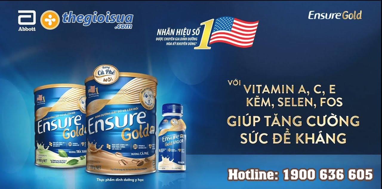 - Sữa bột Ensure Gold nhiều hương vị: Hương vani, ít ngọt hương vani, hương lúa mạch, hương cà phê và Green Health (dùng đạm thực vật).