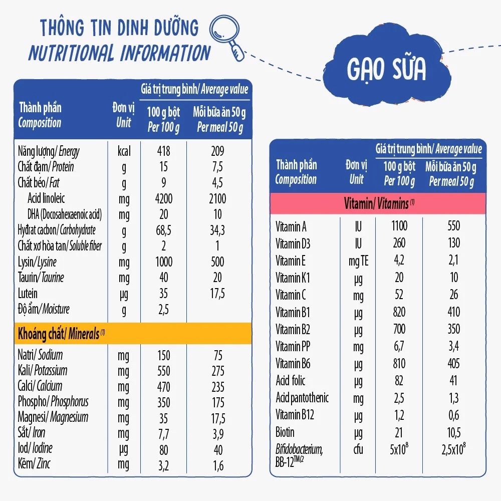 Bột gạo (46%), sữa bột (33,8%), đường tinh luyện, dầu bắp, chất xơ hòa tan inulin, mạch nha, đạm whey, chất béo MCT, các khoáng chất (calci carbonat, sắt pyrophosphat, kẽm sulfat, kali iodid), lysin, các vitamin (natri ascorbat, PP, E, calci D-pantothenat, B1, B6, A, acid folic, K1, biotin, D3), taurin, DHA từ dầu cá, hương vani tổng hợp dùng cho thực phẩm, lutein.