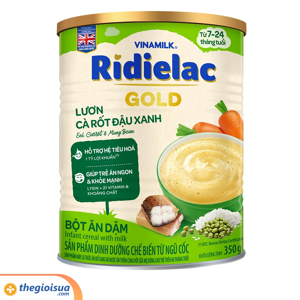 Bột ăn dặm Ridielac Gold Lươn, Cà Rốt, Đậu Xanh hộp thiếc 350g cho bé từ 7-24 tháng. Sản phẩm bổ sung DHA, Lutein hỗ trợ phát triển trí não và võng mạc. Chất xơ hòa tan hỗ trợ tiêu hóa, tăng cường lợi khuẩn cho đường ruột, kết hợp cùng 21 loại Vitamin và khoáng chất cần thiết. Hơn thế, bột có hương vị lươn, cà rốt, đậu xanh thơm ngon nên rất dễ ăn.
