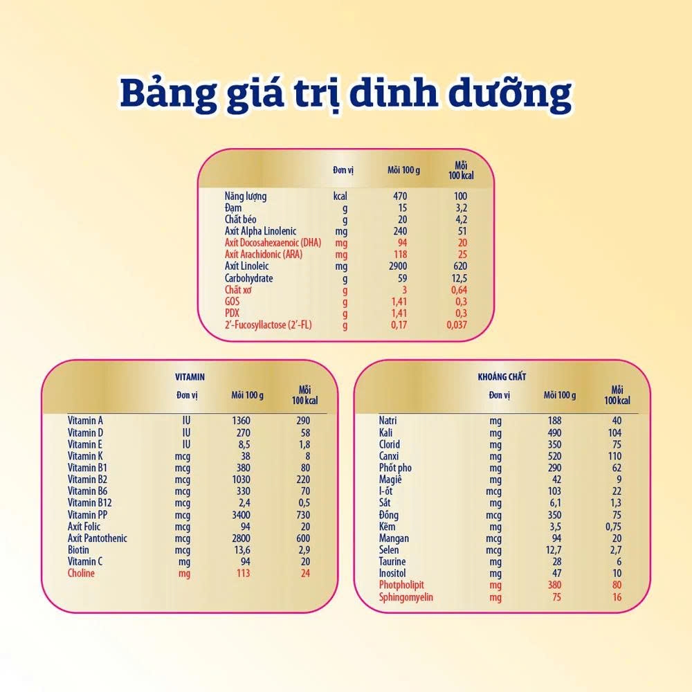 - Đường Lactose, sữa bột tách béo, hỗn hợp đạm whey cô đặc – nguồn của MFGM, hỗn hợp dầu thực vật (dầu cọ olein, dầu dừa, dầu đậu nành, dầu hoa hướng dương), sữa bột nguyên kem, galactooligosaccharide, polydextrose, khoáng chất (canxi carbonat, natri citrat, tricanxi photphat, kali clorid, kali hydroxit, magiê photphat, magiê clorid, sắt sulphat, kẽm sulphat, đồng sulphat, mangan sulphat, natri i-ốt, natri selenit), chất nhũ hóa (lecithin đậu nành), dầu đơn bào là nguồn của Axít Arachidonic (ARA) và Axít Docosahexaenoic (DHA), sirô mật bắp, các vitamin (natri ascorbat, choline clorid, alpha-tocopheryl acetat, vitamin A palmitat, niacinamide, phytonadione, Axít ascorbic, cholecalciferol, canxi pantothenat, cyanocobalamin, riboflavin, thiamine hydroclorid, pyridoxine hydroclorid, Axít folic và biotin), 2’-fucosyllactose, inositol, taurine và chất chống oxy hóa (ascorbyl palmitat INS 304).