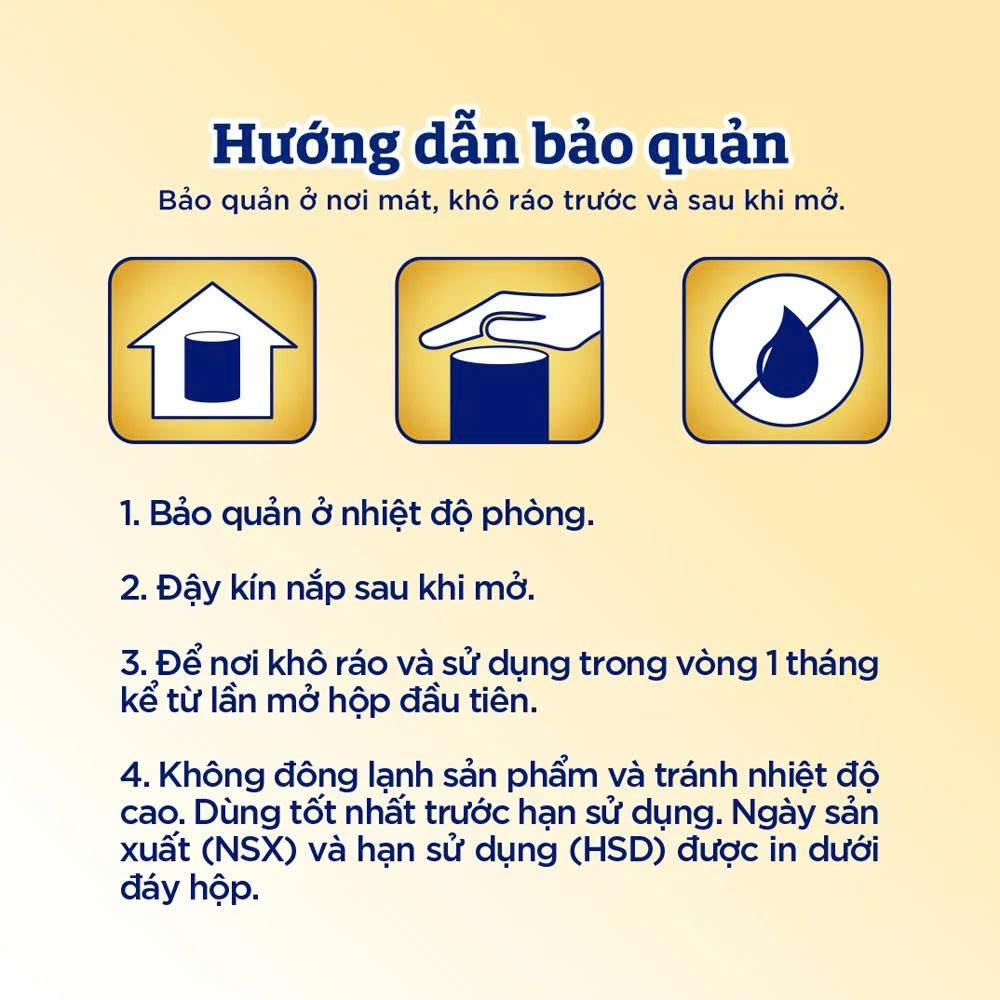 - Bảo quản ở nhiệt độ phòng. Đậy kín nắp sau khi mở. Để nơi khô ráo và sử dụng trong vòng 1 tháng kể từ lần mở hộp đầu tiên. Không đông lạnh sản phẩm và tránh nhiệt độ cao. Dùng tốt nhất trước hạn sử dụng.