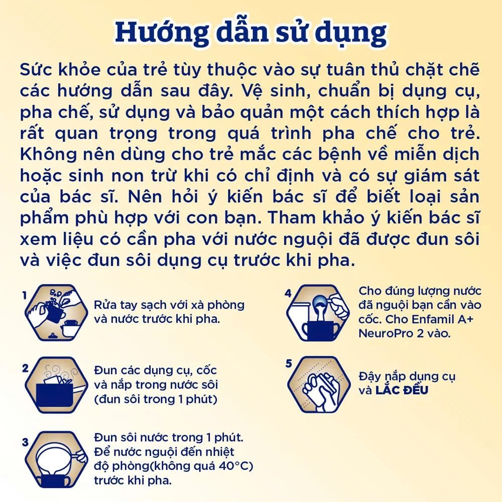 - Độ pha loãng thông thường: 144 g Enfamil A+ NeuroPro 2 với 893 ml nước để pha thành 1000 ml dung dịch.