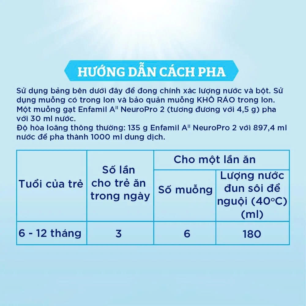 Chỉ sử dụng sản phẩm sữa Enfamil A2 Neuropro 2 này theo hướng dẫn của bác sĩ. Pha chế theo đúng hướng dẫn. Cho trẻ ăn bằng cốc, thìa hợp vệ sinh.