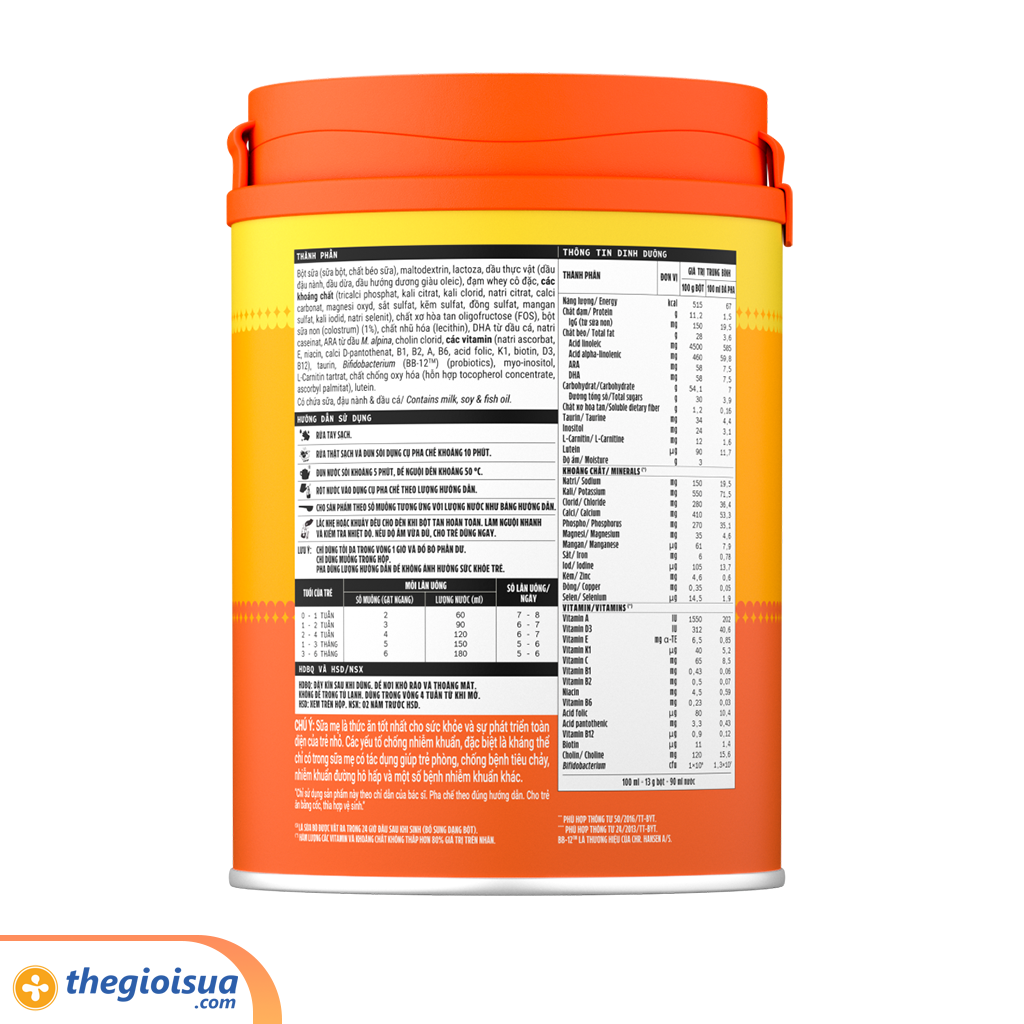 Bột sữa (sữa bột, chất béo sữa), maltodextrin*, lactoza, dầu thực vật (dầu dậu nành, dầu dừa, dầu hướng dương giàu oleic), dạm whey cô dặc, các khoảng chất (tricalci phosphat, kali citrat, kali clorid, natri citrat, calci carbonat, magnesi oxyd, såt sulfat, kém sulfat, dong sulfat, mangan sulfat, kali iodid, natri selenit), chất xơ hòa tan oligofructose (F0S), bột sữa non (colostrum) (1%), chất nhũ hóa** (lecithin), DHA từ dầu cá, natri caseinat, ARA từ dầu M. alpina, cholin clorid, các vitamin (natri ascorbat, E, niacin, calci D-pantothenat, B1, B2, A, B6, acid folic, K1, biotin, D3, B12), taurin, Bifidobacterium (BB-12TM) (probiotics), myo-inositol, L-Carnitin tartrat, chất chống oxy hóa (hỗn hợp tocopherol concentrate, ascorbyl palmitat), lutein. Lưu ý, có chữa sữa, dậu nành và dầu cũ.