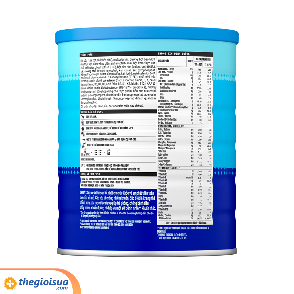 Với nguồn sữa non 24h được nhập khẩu từ Mỹ chứa nhiều kháng thể, đặc biệt kháng thể IgG, cùng với HMO (2’-FL) - prebiotic có cấu trúc tương tự dưỡng chất được tìm thấy trong sữa mẹ, giúp hạn chế sự bám dính của các tác nhân gây nhiễm khuẩn lên thành ruột của trẻ, cùng chất xơ hòa tan FOS và Probiotics BB-12TM giúp tăng hệ vi khuẩn có lợi, hỗ trợ hệ tiêu hóa khỏe mạnh và tăng sức đề kháng.