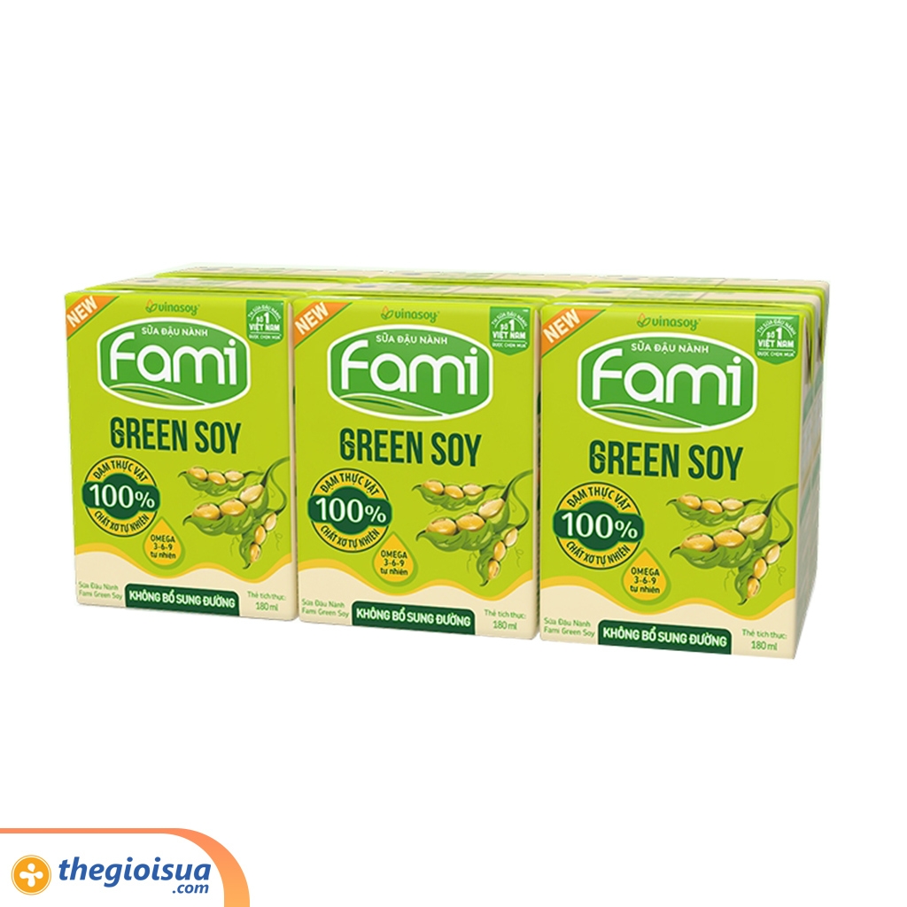 Sữa đậu nành Fami Green Soy không bổ sung đường hộp 180ml - chứa dinh dưỡng thiết yếu từ thực vật và Omega 3 - 6 - 9. Sữa đậu nành Fami Green Soy là dòng sản phẩm sữa đậu nành số 1 tại Việt Nam, không chứa chất bảo quản, không cholesterol, không biến đổi gen.
