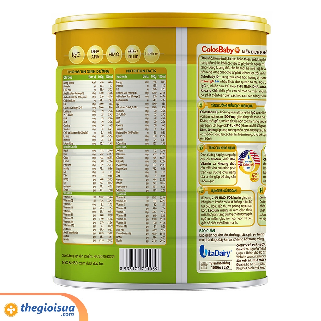 - Sữa ColosBaby Gold 0+ 800g với thành phần cao cấp, an toàn gồm: Bột sữa, dầu thực vật, sucrose, sữa non, chất xơ hòa tan (FOS), khoáng chất (canxi, photpho, kali, natri, magie, sắt, kẽm, selen), vitamin (A, D3, E, K1, C, B1, B2, B6, B12, axit pantothenic, axit folic, choline, taurine), Lactium.