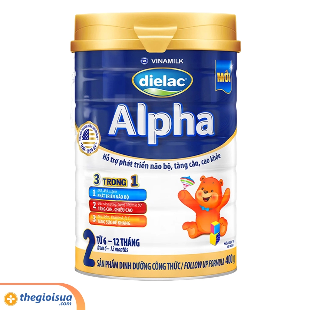 Sữa Dielac Alpha 2 400g dùng cho trẻ từ 6-12 tháng tuổi. Là sản phẩm dinh dưỡng công thức được sử dụng thay thế hoàn toàn hoặc một phần bữa ăn cho trẻ không có hoặc thiếu sữa mẹ. Giai đoạn dưới 1 tuổi, trẻ phát triển và tăng trưởng rất nhanh về cân nặng và não bộ. Nếu cơ thể trẻ được cung cấp đầy đủ dinh dưỡng sẽ tăng cân, khỏe mạnh và phát triển não bộ tốt hơn.