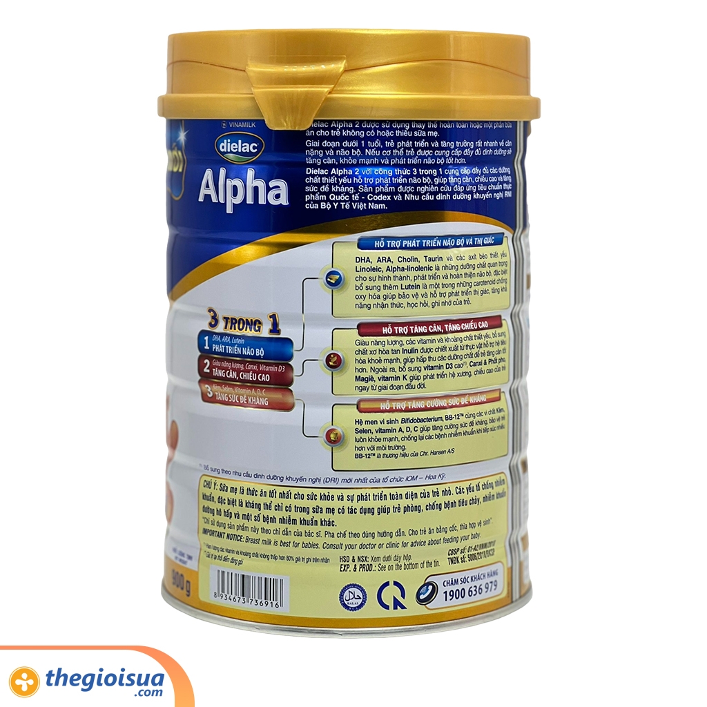 Dielac Alpha với công thức 3 trong 1 cung cấp đầy đủ các dưỡng chất thiết yếu hỗ trợ phát triển não bộ, giúp tăng cân, chiều cao và tăng sức đề kháng. Sản phẩm được nghiên cứu đáp ứng tiêu chuẩn thực phẩm Quốc tế - Codex và Nhu cầu dinh dưỡng khuyến nghị RNI của Bộ Y Tế Việt Nam.