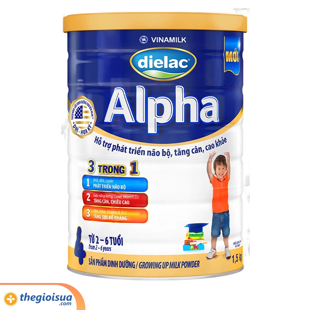 Sữa bột Dielac Alpha 4 1,5Kg là sữa công thức cho trẻ 2 - 6 tuổi. Sữa bột Dielac Alpha 4 với công thức 3 trong 1 cung cấp đầy đủ các dưỡng chất thiết yếu hỗ trợ phát triển não bộ, giúp tăng cân, chiều cao và tăng sức đề kháng. Sản phẩm được nghiên cứu đáp ứng nhu cầu dinh dưỡng khuyến nghị RNI của Bộ Y Tế Việt Nam. Sản phẩm dinh dưỡng được sử dụng bổ sung cho chế độ ăn hàng ngày của trẻ.