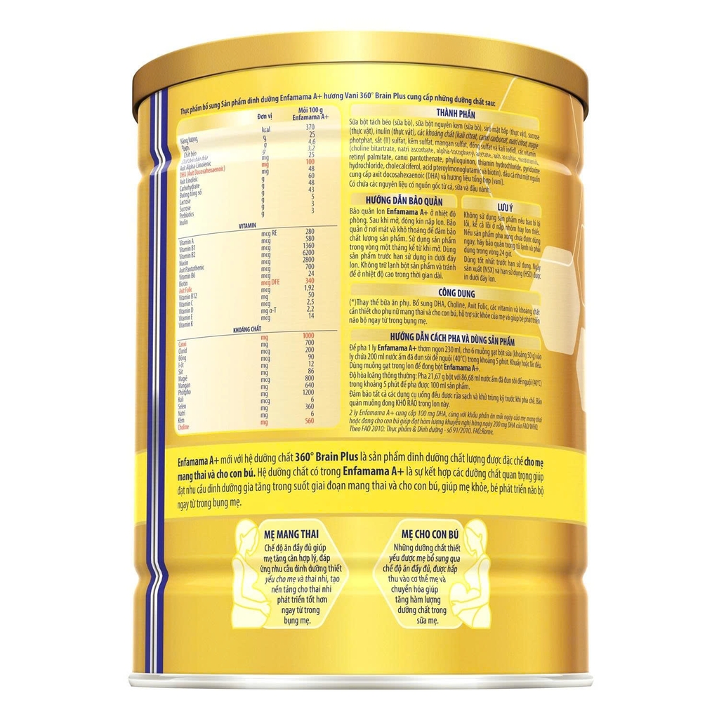 Sữa Enfamama A+ 360 Brain Plus 830g đặc chế không chỉ hỗ trợ bổ sung nhu cầu dinh dưỡng của người mẹ trong giai đoạn mang thai và cho con bú mà còn hỗ trợ thai nhi khỏe mạnh và phát triển trí não tối ưu.