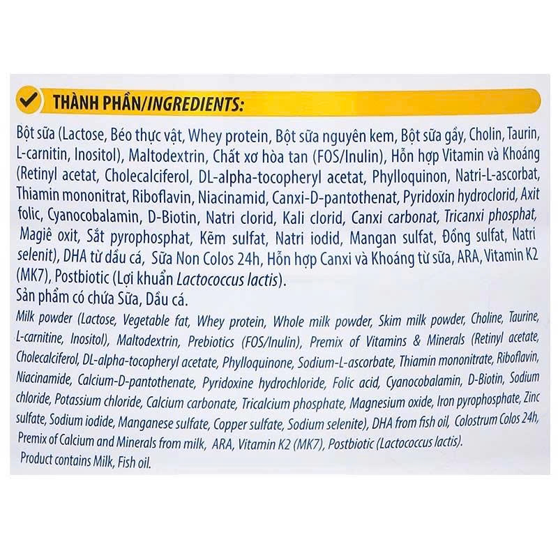 - Hệ miễn dịch & Tiêu hóa: Bổ sung sữa non Colos 24h giàu kháng thể IgG giúp tăng cường đề kháng, kết hợp chất xơ hòa tan FOS và 10 tỷ lợi khuẩn giúp hệ tiêu hóa khỏe mạnh, ngăn ngừa táo bón.