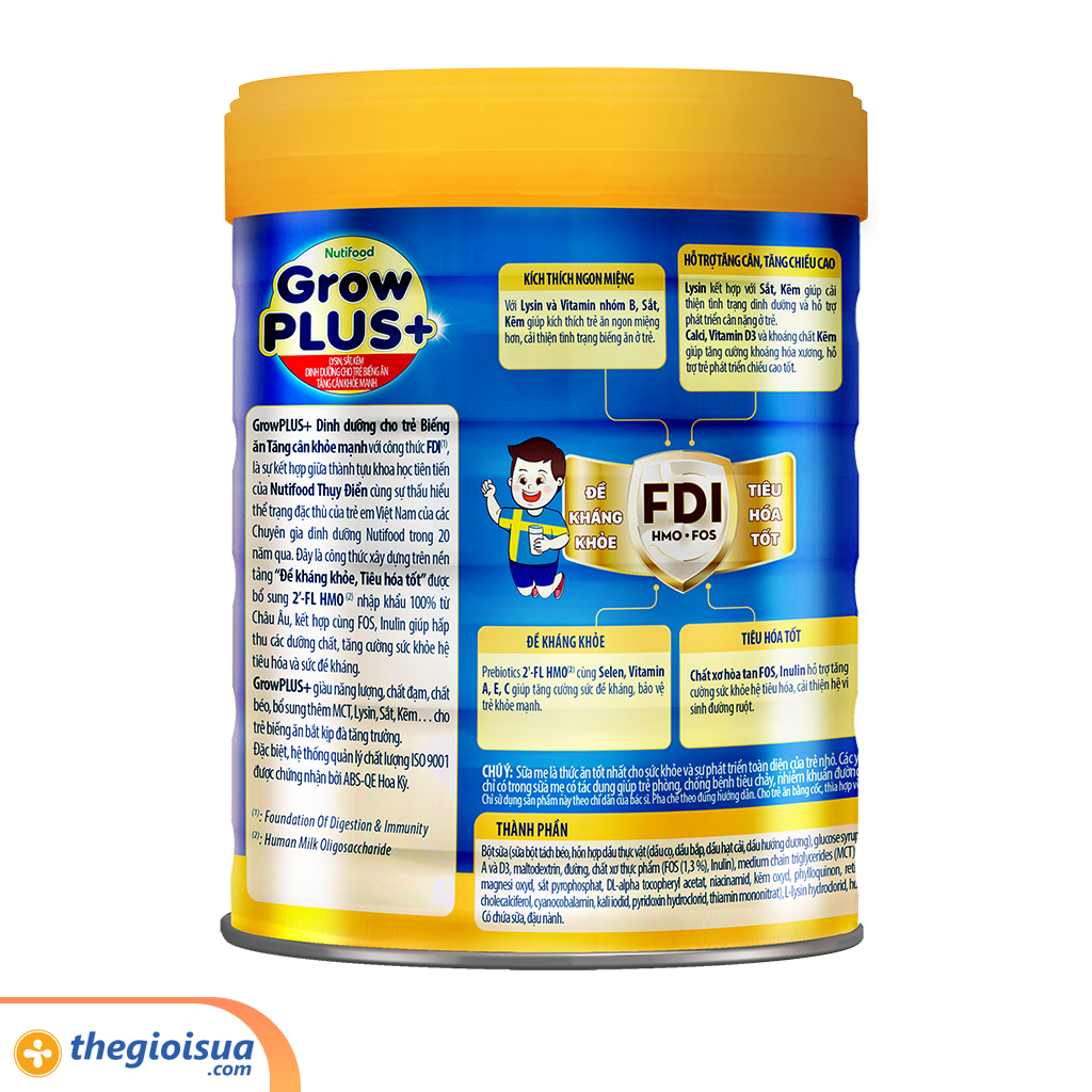 - Sữa bột nguyên kem bổ sung vitamin A&D, Maltodextrin, đường sucrose, chất xơ thực phẩm (FOS/Inulin) Lysin, hương liệu tổng hợp dùngh co thực phẩm, hỗ hợp vitamin và khoáng chất Sắt, Pyrophosphat, axit folic, thiamin mononitrat, niacinamid, canxi d-pantothenat, pyridoxin hydroclorid, kẽm sunphat.