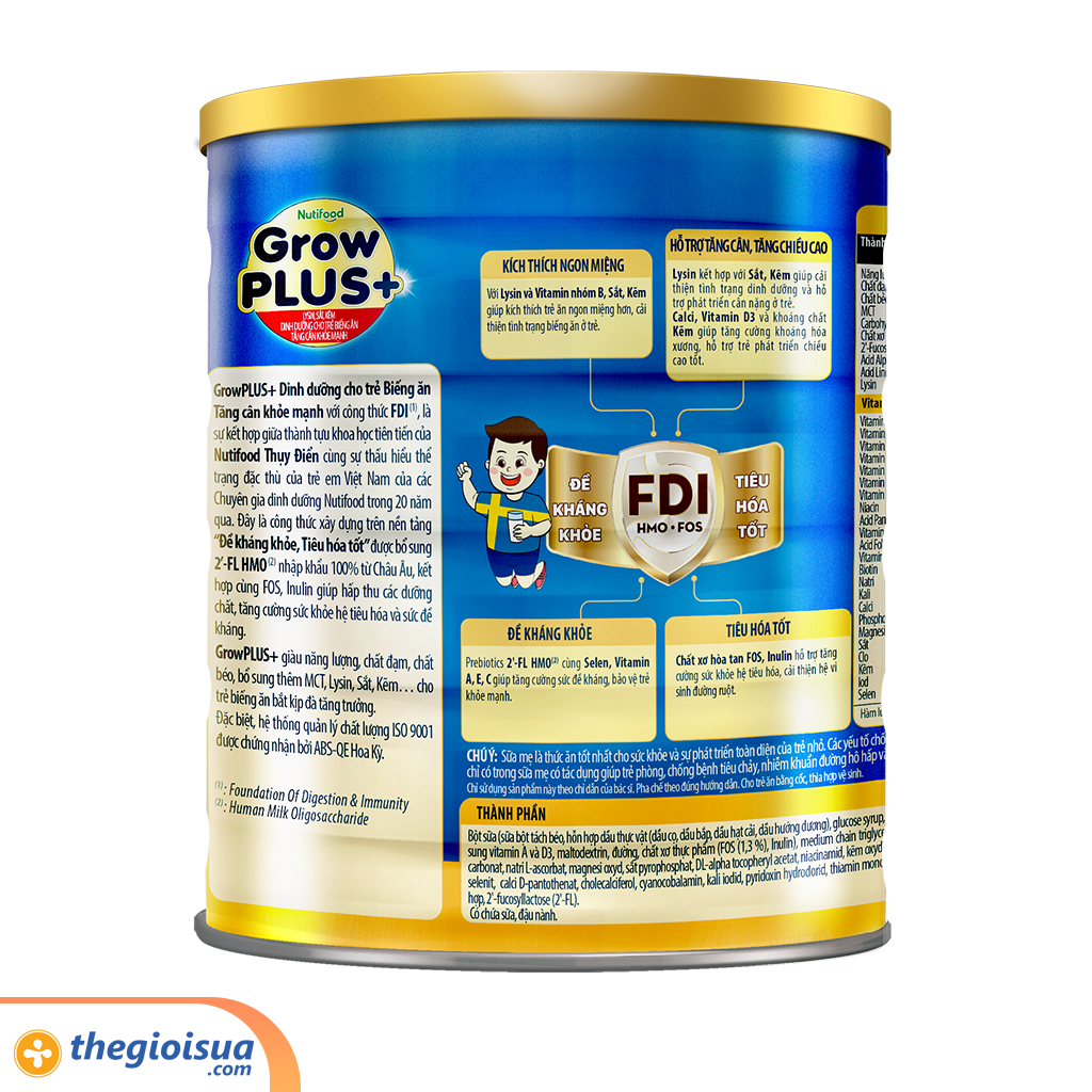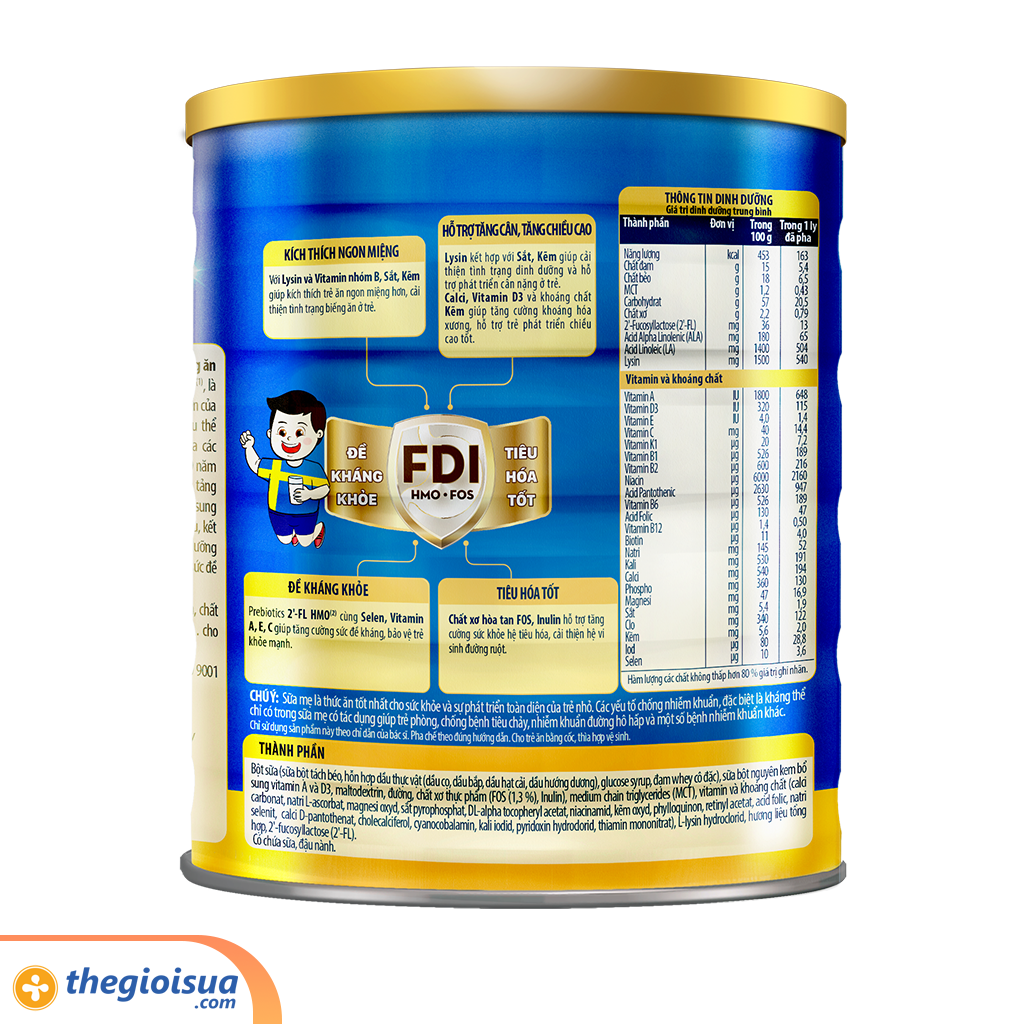 - Sữa bột nguyên kem bổ sung vitamin A&D, Maltodextrin, đường sucrose, chất xơ thực phẩm (FOS/Inulin) Lysin, hương liệu tổng hợp dùngh co thực phẩm, hỗ hợp vitamin và khoáng chất Sắt, Pyrophosphat, axit folic, thiamin mononitrat, niacinamid, canxi d-pantothenat, pyridoxin hydroclorid, kẽm sunphat.