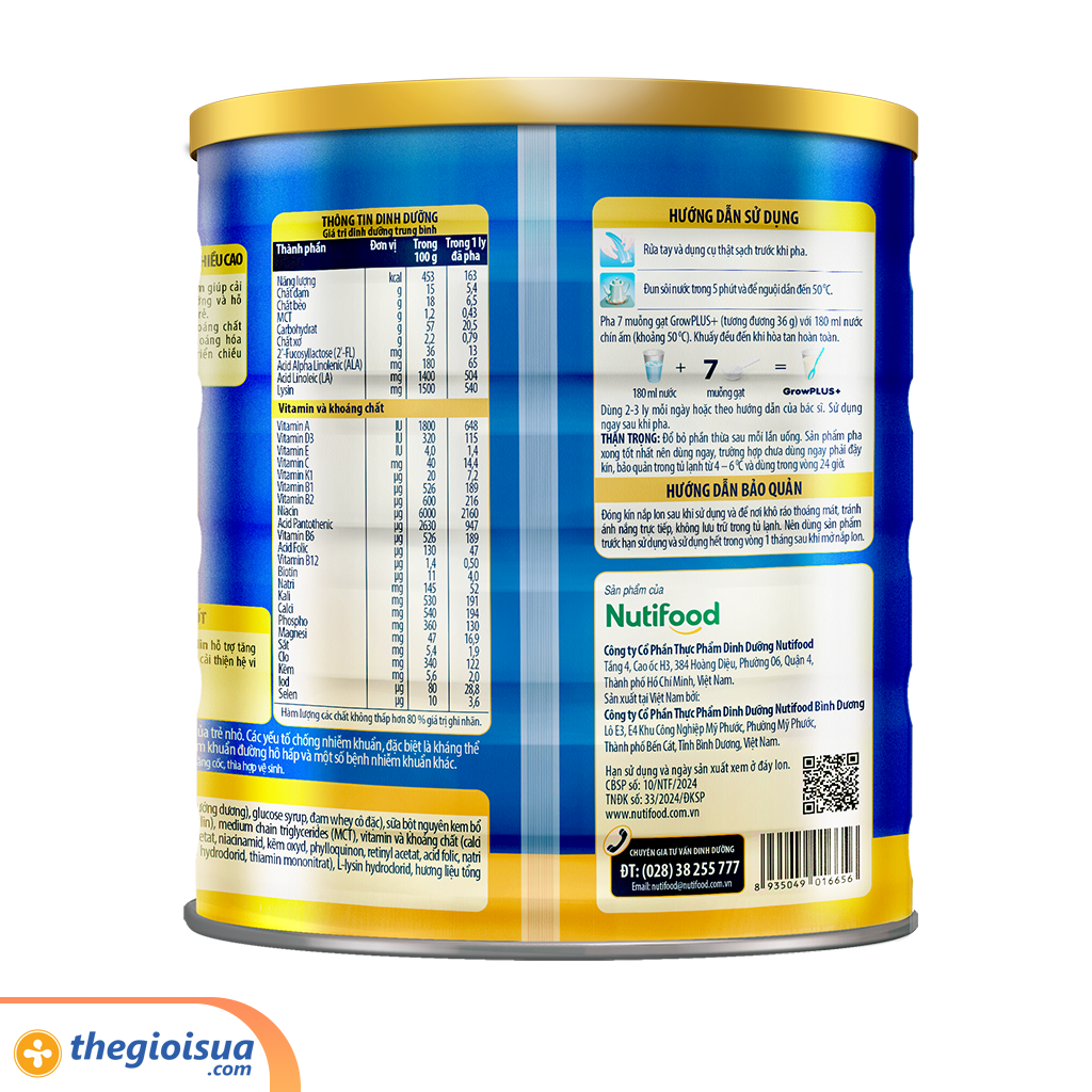 - 1 lon Sữa bột Nuti Grow PLUS+ cho bé từ 1 đến 2 tuổi (Xanh) Lon 1,5kg pha được khoảng 40 ly Grow Plus+ mỗi ly 200ml. Sử dụng ngay sau khi pha.