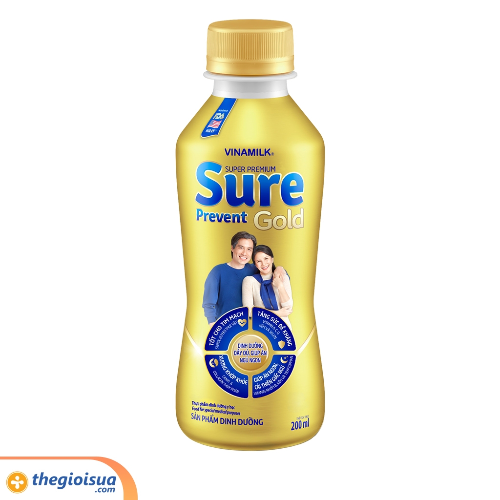 - Sữa bột pha sẵn Vinamilk Sure Prevent Gold chai 200ml là sản phẩm dinh dưỡng đã được chứng minh lâm sàng với hệ dưỡng chất cân bằng để chăm sóc sức khỏe toàn diện cho Người Cao Tuổi và người bệnh cần phục hồi.