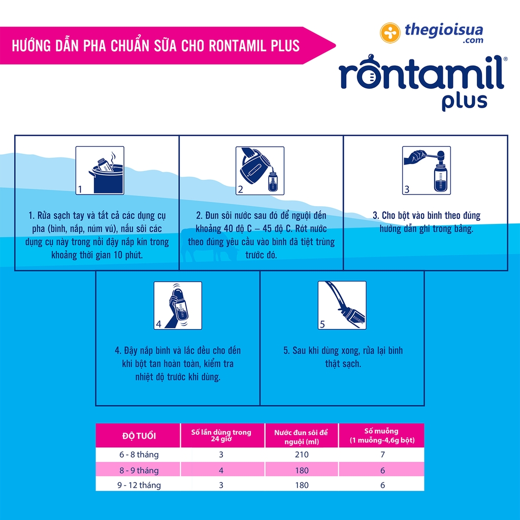 Để pha 1 ly sữa Rontamil Plus 2, trước tiên cần rửa tay sạch sẽ và tiệt trùng toàn bộ dụng cụ pha sữa. Đun sôi nước sạch trong khoảng 5 phút, sau đó để nguội đến nhiệt độ khoảng 40–45°C. Đổ lượng nước tương ứng vào bình pha, thêm số muỗng bột theo đúng hướng dẫn độ tuổi của bé, đậy nắp bình và lắc đều cho đến khi bột tan hoàn toàn.