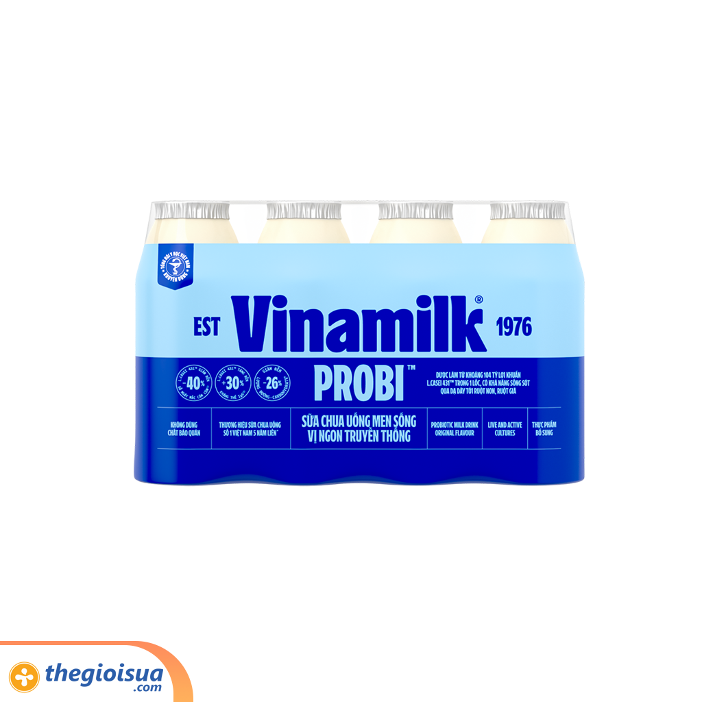 - Sữa chua uống men sống thanh trùng ngày càng được mọi người yêu thích bởi những lợi ích mà thức uống này mang lại cho sức khỏe của mọi người. Sản phẩm lốc 4 chai sữa chua uống men sống Vinamilk Probi 130ml được thương hiệu sữa quốc dân Vinamilk sản xuất được người tiêu dùng vô cùng ưa chuộng và tin tưởng. Ngoài ra, dung tích lớn giúp người dùng nhanh chóng nạp ngay tỷ lệ khuẩn nhanh chóng.