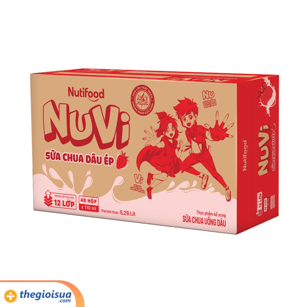 - Sữa chua uống NuVi Dâu với thành phần từ sữa chua lên men tự nhiên hòa quyện với nước ép dâu cho vị ngon bổ dưỡng, thanh khiết.