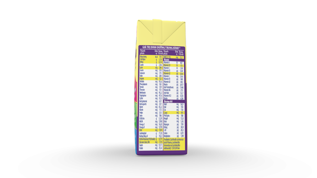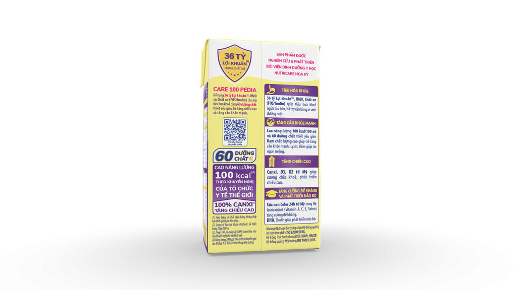 (*) Lượng tế bào Lợi khuẩn Postbiotic tối thiểu trong 100 g bột. (**) Cao năng lượng 100 kcal/100 ml theo khuyến nghị của Tổ Chức Y Tế Thế Giới cho trẻ suy dinh dưỡng.