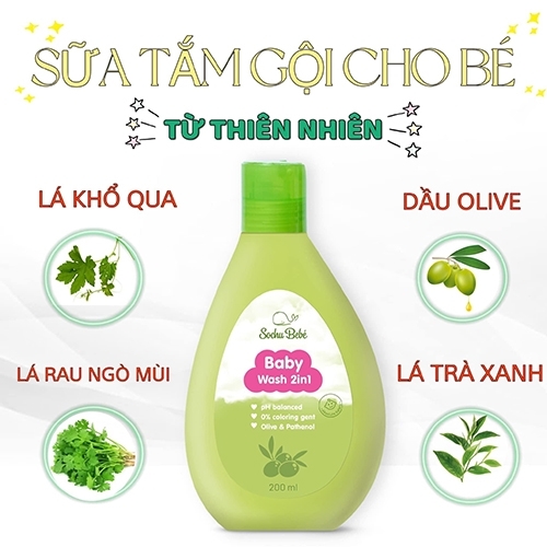 Sữa tắm gội cho bé 2 in 1 Sochu Bebé Baby Wash chứa thành phần thiên nhiên như: lá khổ qua, dầu Olive, lá rau ngò mùi, lá trà xanh giúp ngăn kích ứng, sát khuẩn, ngừa viêm và làm lành da, giảm các triệu chứng nổi mẩn đỏ, rôm sảy, ngứa ngáy và hăm. Sản phẩm giúp làm sạch nhẹ nhàng, làm mềm tóc và da bé, nâng niu làn da mỏng manh của con với công thức tear-free không cay mắt, 0% xà phòng an toàn cho làn da em bé.